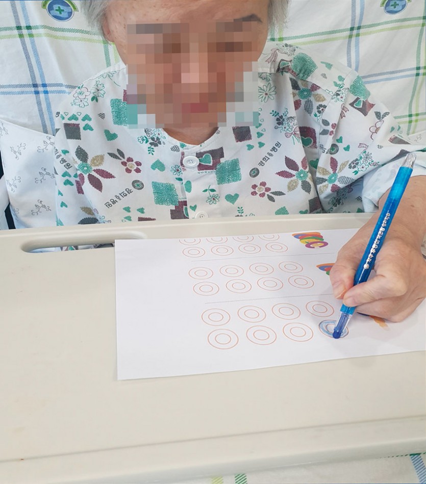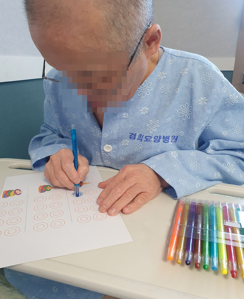 다양한 색깔로 고리를 칠하셨다가 도안에 고리 색깔별로 칠하시는 어르신의 모습을 볼 수 있었어요~!